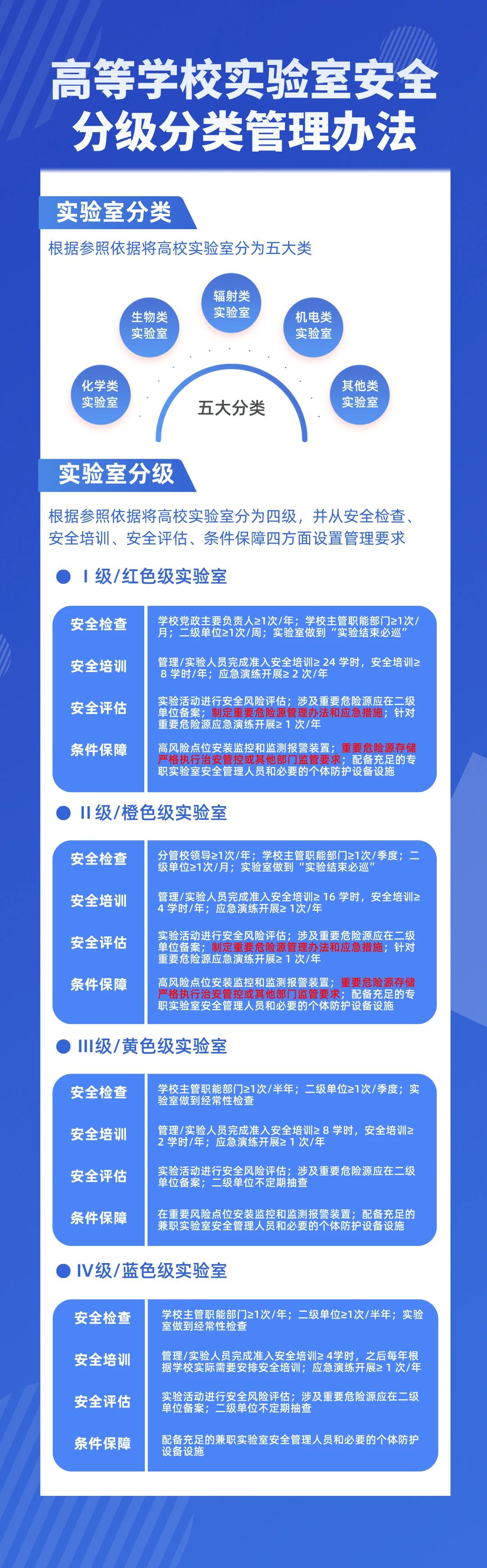 近日,教育部印發(fā)《高等學(xué)校實驗室安全分級分類管理辦法(試行)》,對高校實驗室安全分級分類管理的責(zé)任體系、工作原則、管理要求等作出相關(guān)規(guī)定。