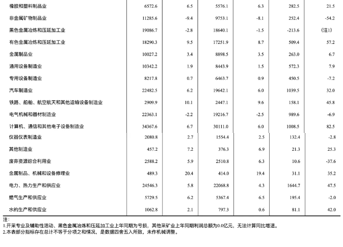 1-3月份,主要行業利潤情況如下:計算機、通信和其他電子設備制造業利潤增長82.5%,有色金屬冶煉和壓延加工業增長57.2%,電力、熱力生產和供應業增長47.5%,汽車制造業增長32.0%,紡織業增長25.0%,通用設備制造業增長7.9%,石油和天然氣開采業增長3.8%,農副食品加工業增長2.0%,化學原料和化學制品制造業下降3.5%,電氣機械和器材制造業下降6.9%,專用設備制造業下降7.2%,煤炭開采和洗選業下降33.5%,非金屬礦物制品業下降54.2%,石油煤炭及其他燃料加工業由盈轉虧,黑色金屬冶煉和壓延加工業虧損增加。
