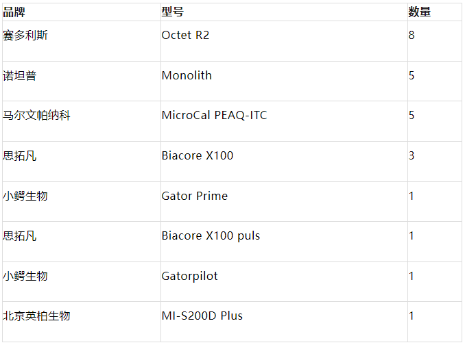 在所有中標(biāo)產(chǎn)品中,中標(biāo)型號前三名分別是思拓凡的Biacore 1K、諾坦普的Monolith、賽多利斯的Octet R2,中標(biāo)數(shù)量排名第四的是馬爾文帕納科的MicroCal PEAQ-ITC,其次思拓凡的Biacore 8K和Biacore X100、賽多利斯的Octet R8和Octet R4、諾坦普的Prometheus Panta、小鱷生物的GatorPilot分別占據(jù)第5-10名的席位??偟膩砜此纪胤埠唾惗嗬沟闹袠?biāo)型號最多,各有三個,表現(xiàn)出較高的市場認(rèn)可度,諾坦普占據(jù)兩席,穩(wěn)穩(wěn)站住榜單前三的位置。