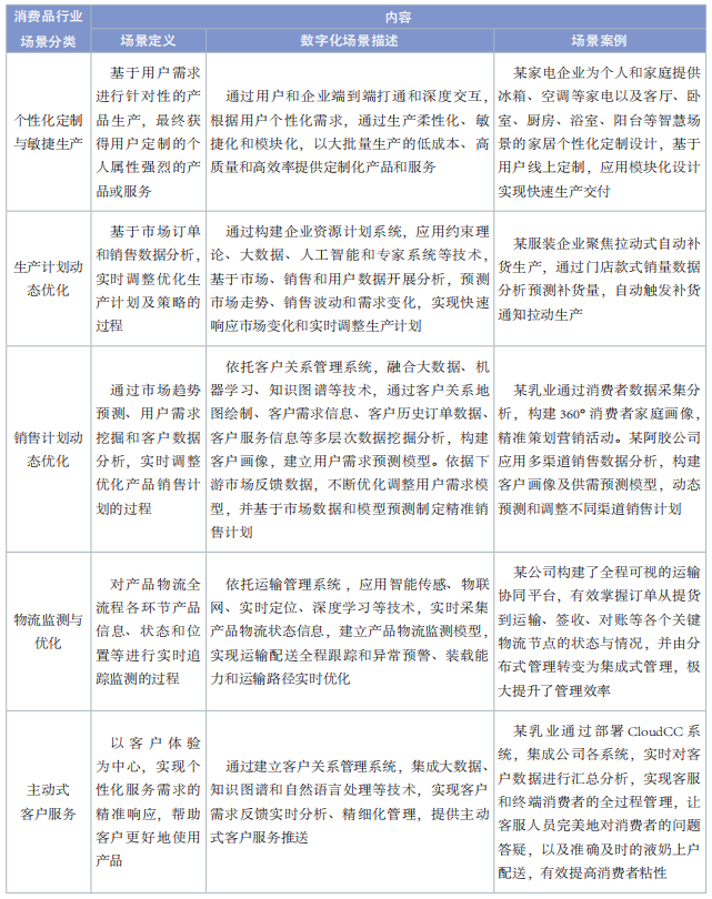 消費品包括食品飲料、 生物醫藥、 家電服裝、家居日化等行業門類,涵蓋離散制造和流程制造,以客戶為中心組織生產是行業主要特點。消費品行業數字化轉型要聚焦人工智能、區塊鏈、數字孿生等新技術和大規模個性化定制、銷售驅動業務優化等典型場景,打造以用戶需求為中心的制造體系,提升全生命周期質量管控、需求敏捷感知和產銷用協同能力?;诖耍疚恼沓鰝€性化定制與敏捷生產、生產計劃動態優化和銷售計劃動態優化、物流監測與優化等 5 個典型場景,詳細場景內容見表 4。