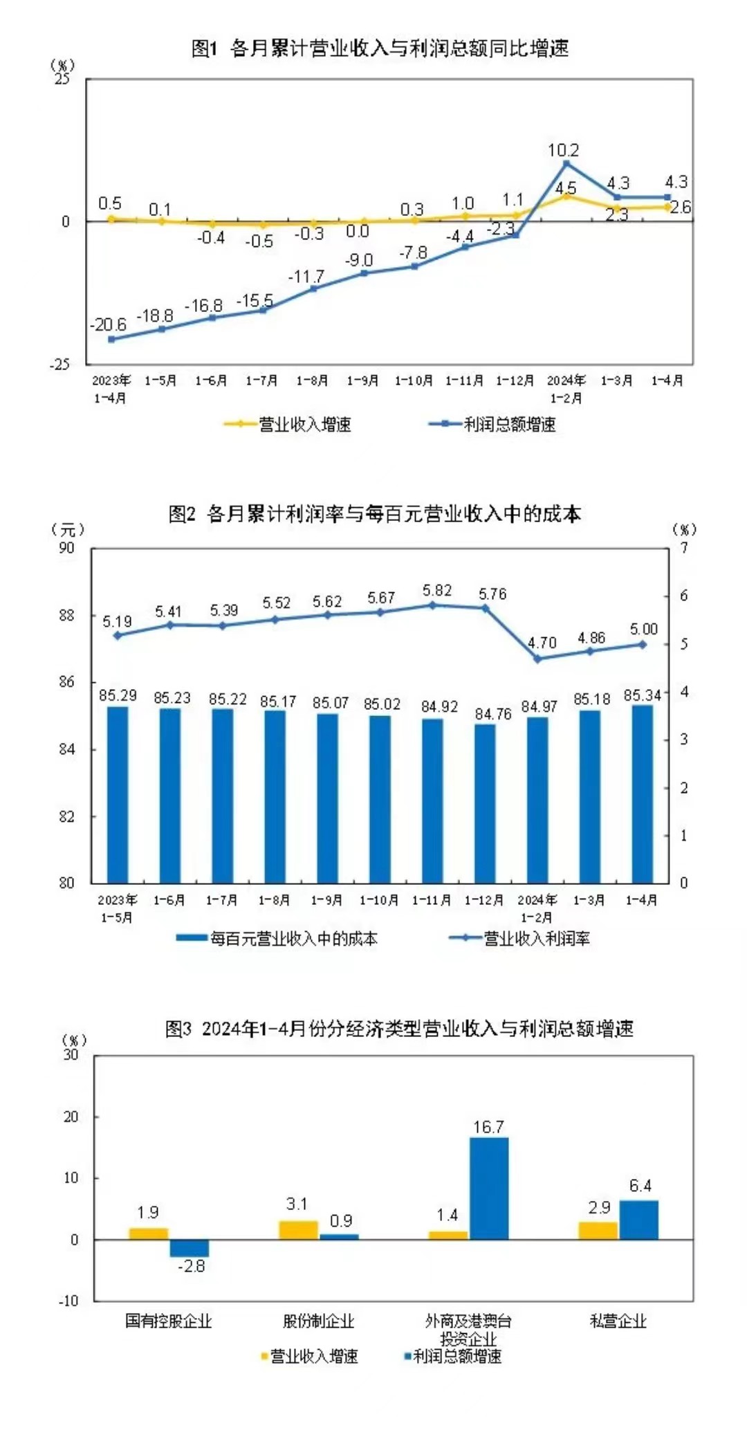 1—4月份,規(guī)模以上工業(yè)企業(yè)中,國有控股企業(yè)實現(xiàn)利潤總額7396.4億元,同比下降2.8%;股份制企業(yè)實現(xiàn)利潤總額15508.1億元,增長0.9%;外商及港澳臺投資企業(yè)實現(xiàn)利潤總額5285.9億元,增長16.7%;私營企業(yè)實現(xiàn)利潤總額5448.0億元,增長6.4%。