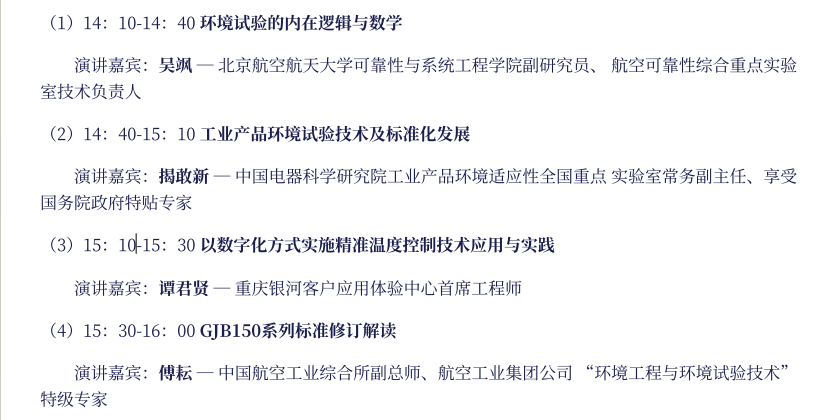 另一盛典,是由銀河儀器承辦的“環境與可靠性試驗技術前沿探討與實踐應用”專題論壇分會場。論壇由銀河儀器副總經理曹軍主持舉行,邀請中國儀器儀表行業協會副秘書長鄭朝松致辭;吳颯(北京航空航天⼤學可靠性與系統⼯程學院副研究員、航空可靠性綜合重點實驗室技術負責⼈)、揭敢新(中國電器科學研究院⼯業產品環境適應性全國重點實驗室常務副主任)、傅耘(中國航空⼯業綜合所副總師、航空⼯業集團公司 “環境⼯程與環境試驗技術” 特級專家)、譚君賢(重慶銀河客⼾應⽤體驗中⼼⾸席⼯程師)等幾位行業專家在會上做分享報告。論壇現場座無虛席,人頭攢動,觀眾頻頻舉起手機拍照,在專業觀眾熱烈的掌聲中,論壇圓滿結束。