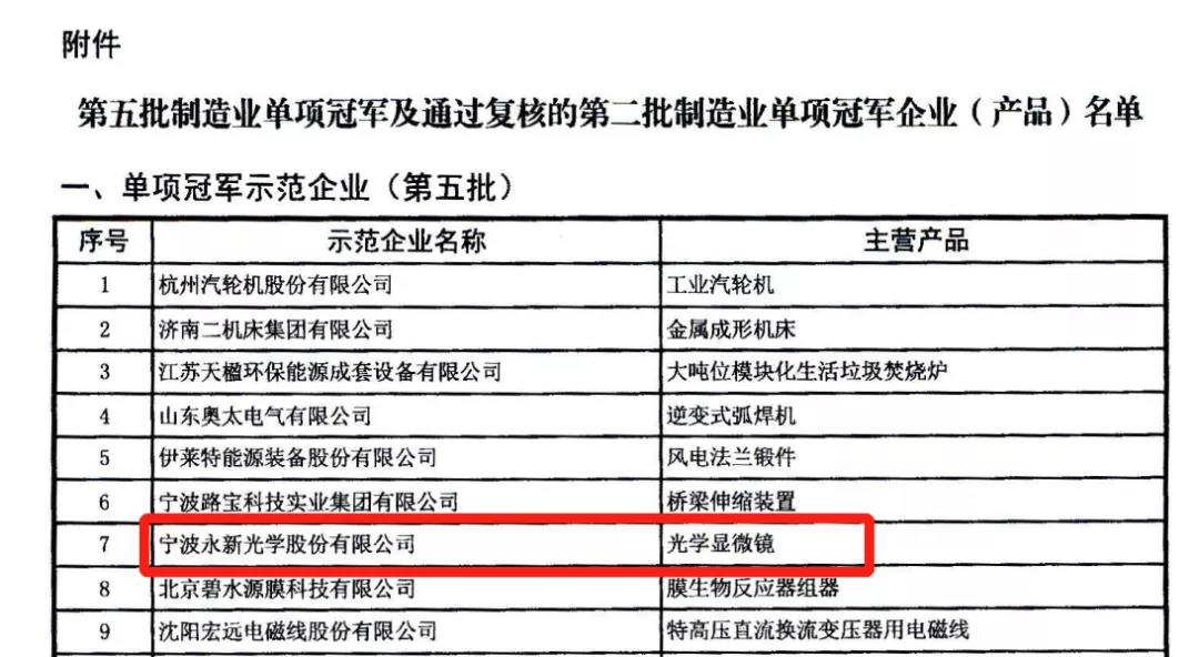 近日,工業和信息化部和中國工業經濟聯合會公布了第五批制造業單項冠軍及通過復核的第二批制造業單項冠軍企業(產品)名單(工信部聯政法函〔2020〕351號),寧波永新光學股份有限公司成功復評升級為第五批國家級制造業“單項冠軍示范企業”。