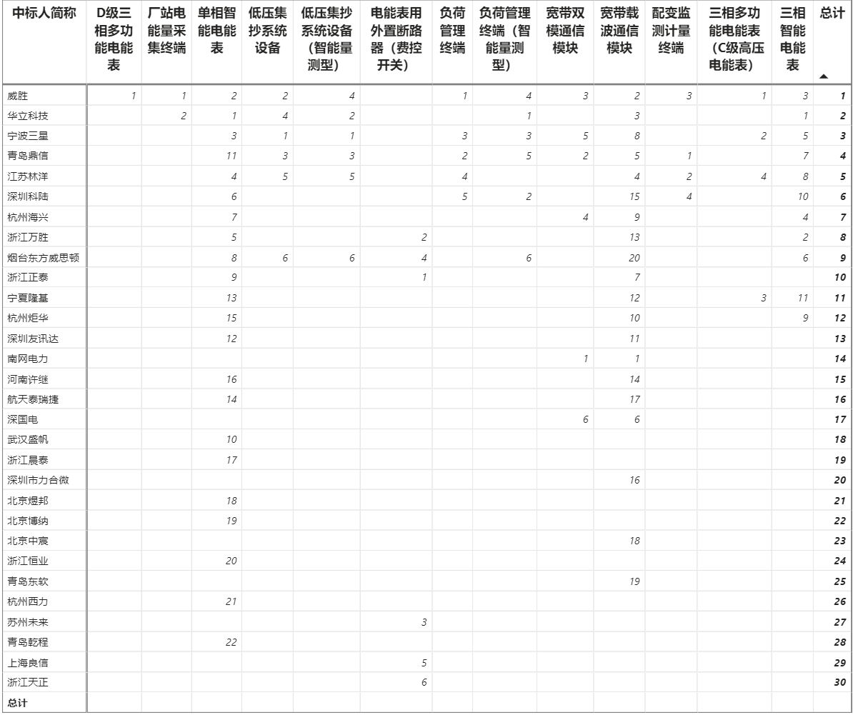 總金額43.68億元,30家企業實現中標(威勝集團+威勝信息計為1家,正泰電器+正泰儀表計為1家),威勝以4.32億元位列各企業第一名,華立中標3.97億元第二,三星3.80億元第三,鼎信3.53億元第四。