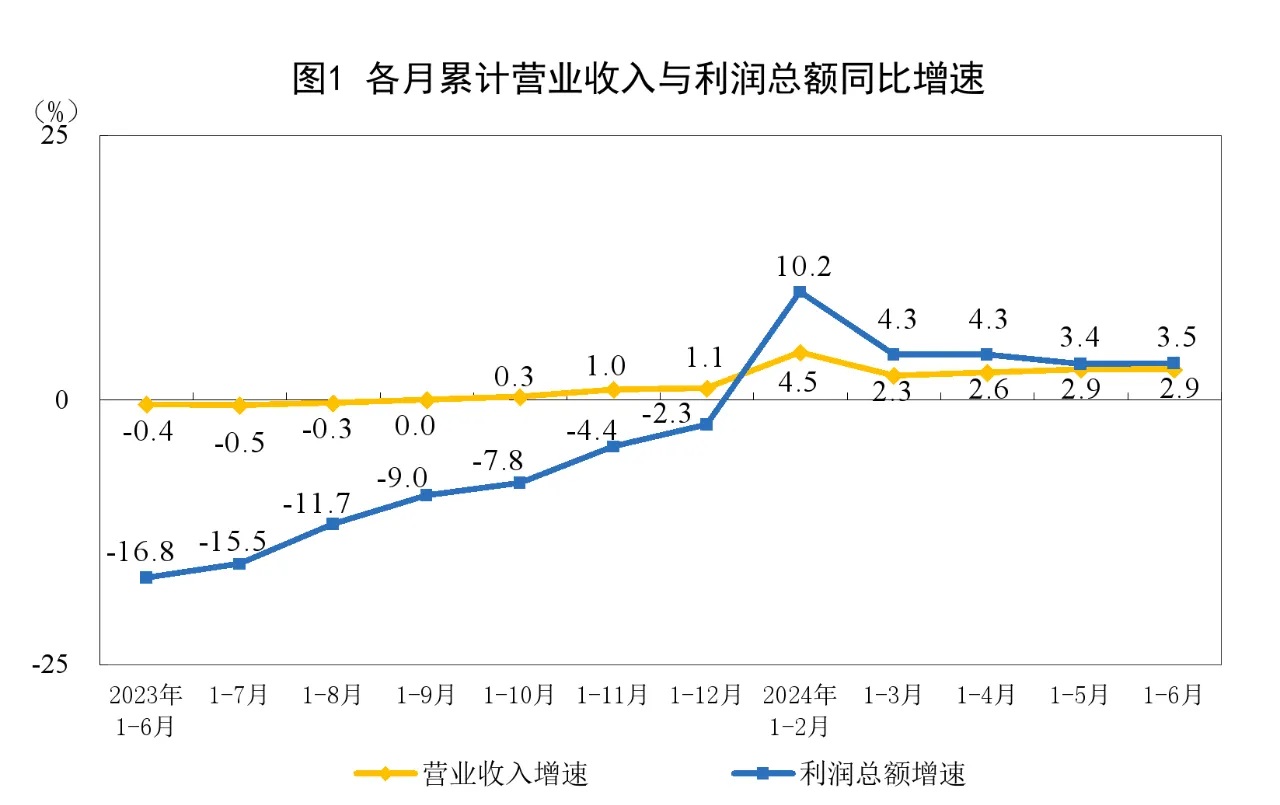 1—6月份,規模以上工業企業實現營業收入64.86萬億元,同比增長2.9%;發生營業成本55.31萬億元,增長2.9%;營業收入利潤率為5.41%,同比提高0.03個百分點。