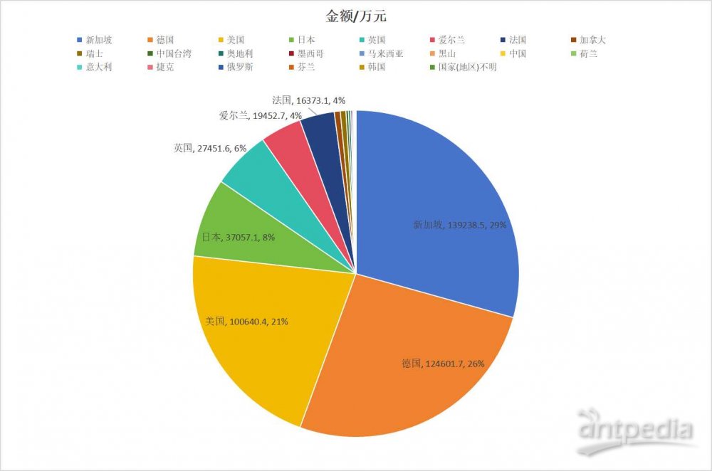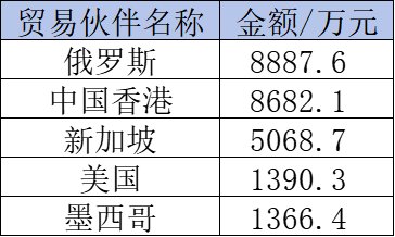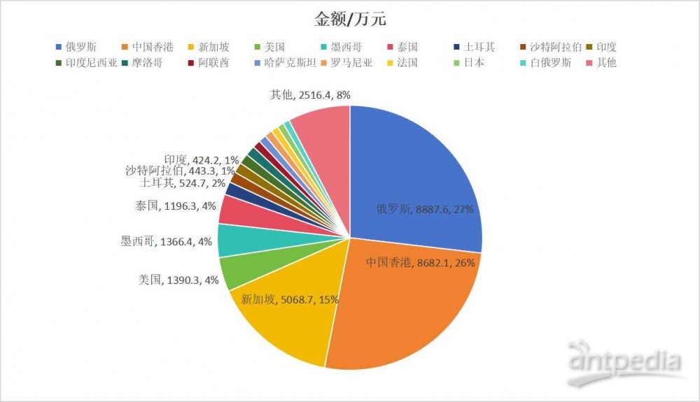 出口質(zhì)譜儀金額3.3億元,排名前五的國家/地區(qū),俄羅斯8887.6萬元,銷往中國香港8682.1萬元,新加坡5068.7萬元,美國1390.3萬元,墨西哥1366.4萬元。
