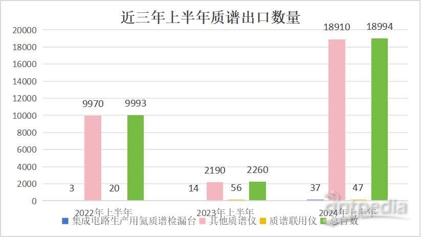 近三年上半年質(zhì)譜儀出口數(shù)量呈上升趨勢,其中,集成電路生產(chǎn)用氦質(zhì)譜檢漏臺從2022年上半年的3臺增加至2024年上半年的37臺套。其他質(zhì)譜儀出口數(shù)量尤為明顯,質(zhì)譜聯(lián)用儀2024年上半年出口較2023年上半年有所下降,但較于2022年的20臺套,增加至47臺套。