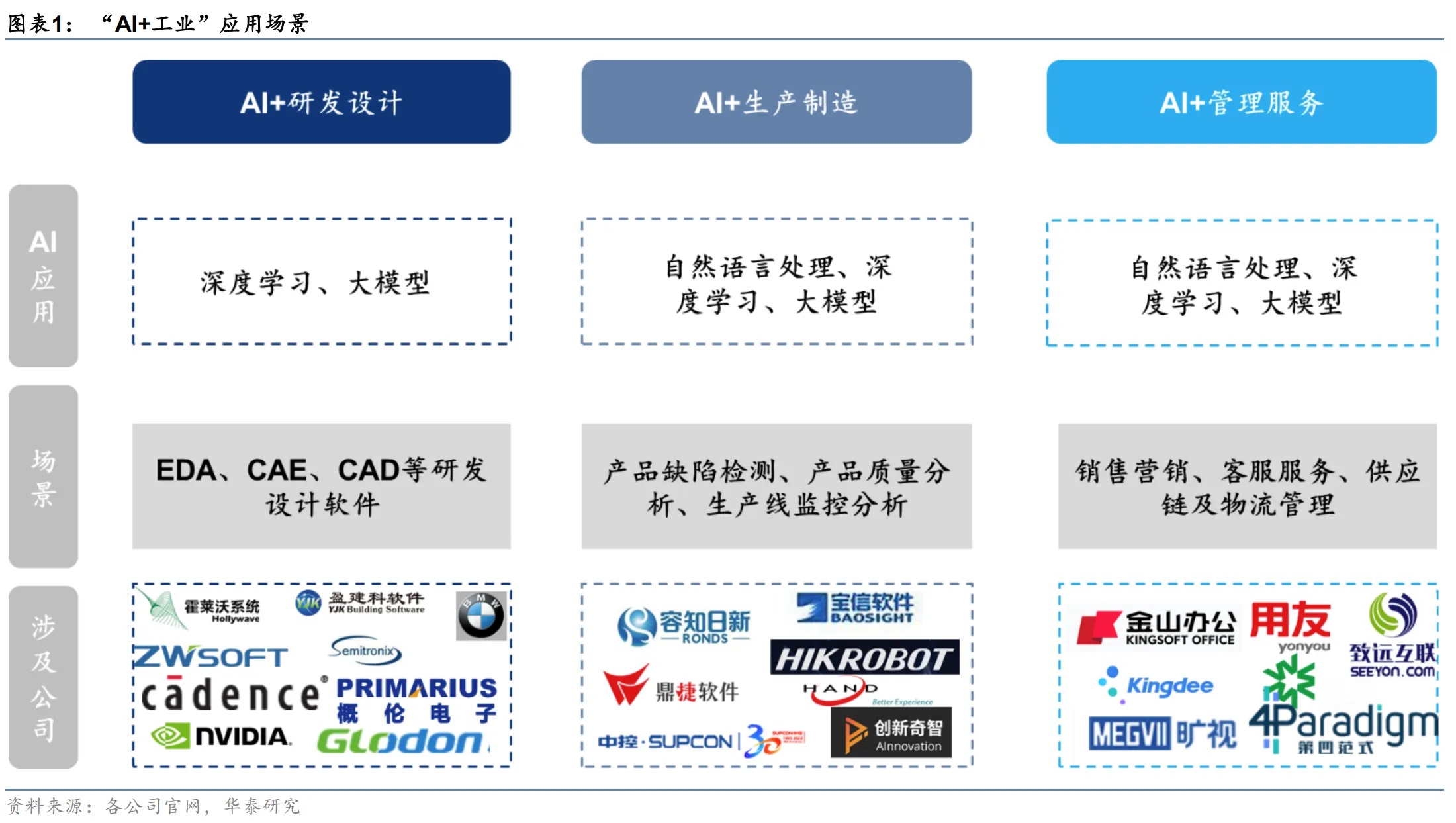 我們看好:1)研發(fā)設(shè)計(jì),AI有望增進(jìn)用戶使用EDA/CAD設(shè)計(jì)及CAE仿真優(yōu)化等軟件的效率;2)生產(chǎn)制造,AI有望強(qiáng)化工業(yè)機(jī)器人的信息處理、感知執(zhí)行等能力;3)管理服務(wù),AI已經(jīng)被用于基本辦公領(lǐng)域,預(yù)計(jì)未來將進(jìn)一步擴(kuò)展至供應(yīng)鏈管理、客服服務(wù)和市場營銷等其他應(yīng)用場景。