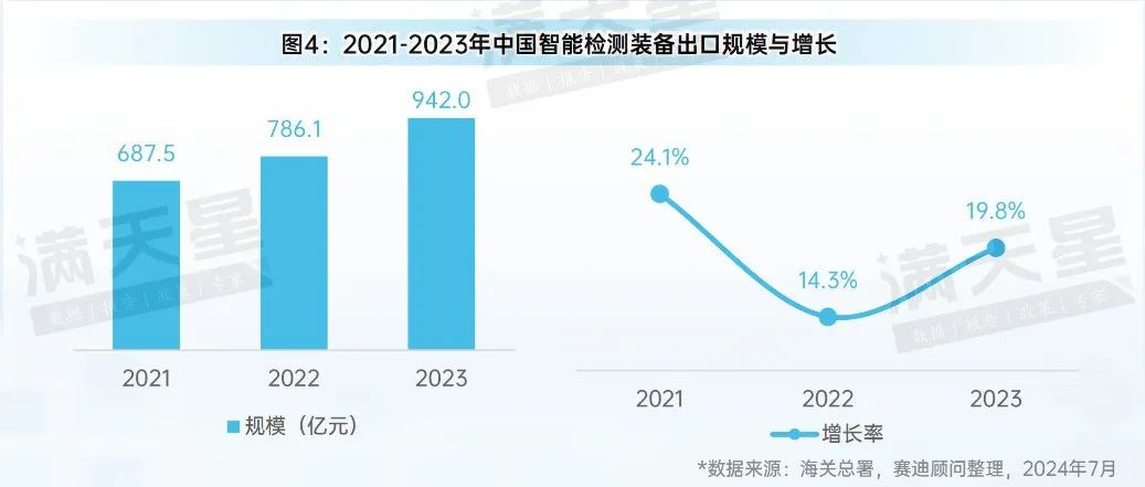 圖4:2021-2023年中國智能檢測裝備出口規(guī)模與增長