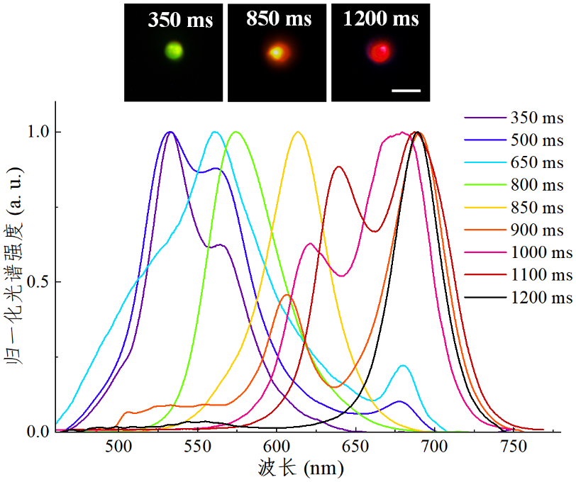 圖3(d)中綠色發(fā)光CsPbBr3納米晶和黃色CsPb(Br1−xIx)3納米晶線條組成的“鳥(niǎo)”圖案。在Br-Cl共摻的玻璃中,利用激光直寫(xiě)出了綠色CsPbBr3納米晶和藍(lán)色 CsPb(Br1−xClx)3納米晶軌跡線組成的“鳥(niǎo)”圖案。在Cl-Br-I三種鹵素共摻的玻璃中展示了全彩色的“蝴蝶”圖案直寫(xiě)(圖3)。除二維圖案外,利用納米位移平臺(tái)在玻璃內(nèi)部的精度定位和移動(dòng),還實(shí)現(xiàn)了三維空間內(nèi)微米“螺旋線”的直寫(xiě),展示該技術(shù)方案鈣鈦礦材料在三維圖案化方面的巨大潛力。
