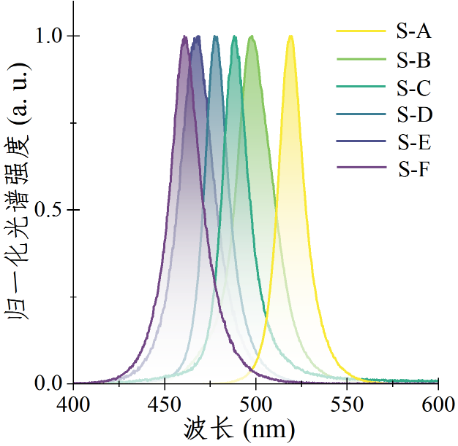 除A位鹵素陰離子帶隙可控的納米晶直寫(xiě)外,研究人員在B位Cd/Pb陽(yáng)離子體系證明了該方法可以調(diào)控玻璃中局部的納米液相分離和離子交換過(guò)程,并有效的控制元素的重新分布并調(diào)控局部化學(xué)成分。通過(guò)優(yōu)化脈沖持續(xù)時(shí)間、重復(fù)頻率和脈沖能量以及玻璃組分中Cd/Pb的比例,在含銫、鉛、鎘和鹵化物元素的硼硅酸鹽玻璃中實(shí)現(xiàn)了超快激光誘導(dǎo)CsPbxCd1-xBr3納米晶析出,其發(fā)光波長(zhǎng)可調(diào)范圍為461 nm~514 nm(圖2)。