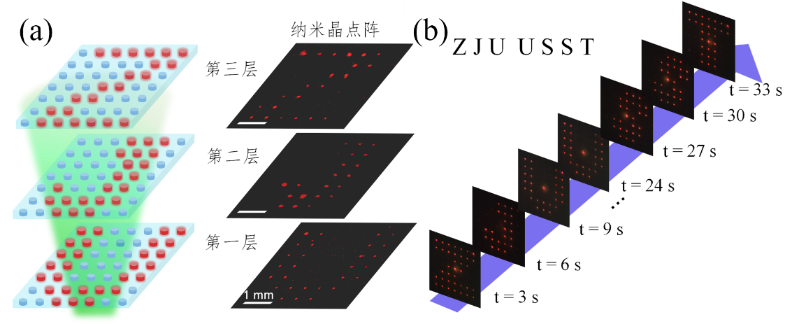 除二維的平面顯示外,該技術(shù)方案還能演示三維的全息顯示器件。將立體的圖案通過(guò)空間光調(diào)制器設(shè)計(jì)的全息圖在多個(gè)平面上分層顯示,可以同時(shí)激發(fā)點(diǎn)亮不同層的圖案。如圖 5(a)所示,三幅全息圖像(字母Z、J和U)激發(fā)的熒光圖案在沿激發(fā)光輻照方向上的多個(gè)平面上同時(shí)被構(gòu)建,在不同層顯示了對(duì)應(yīng)的字母Z、J和U的紅色熒光圖案。預(yù)先設(shè)置好的全息圖案的播放時(shí)間和順序,在內(nèi)部具有多個(gè)納米晶發(fā)光單元陣列的玻璃基板上還能實(shí)現(xiàn)動(dòng)態(tài)的全息顯示,如圖5(b)在不同時(shí)刻分別顯示了字母Z、J、U、U、S、S、T的熒光圖案。