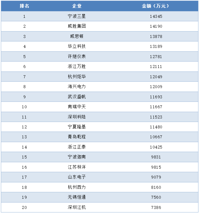 A級(jí)單相智能電能表中標(biāo)金額前十企業(yè)