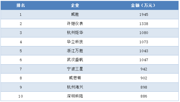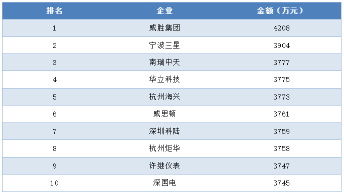 集中器及采集器中標(biāo)金額前十企業(yè)