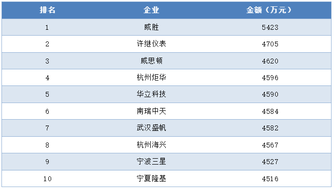 C級(jí)三相智能電能表中標(biāo)金額前十企業(yè)