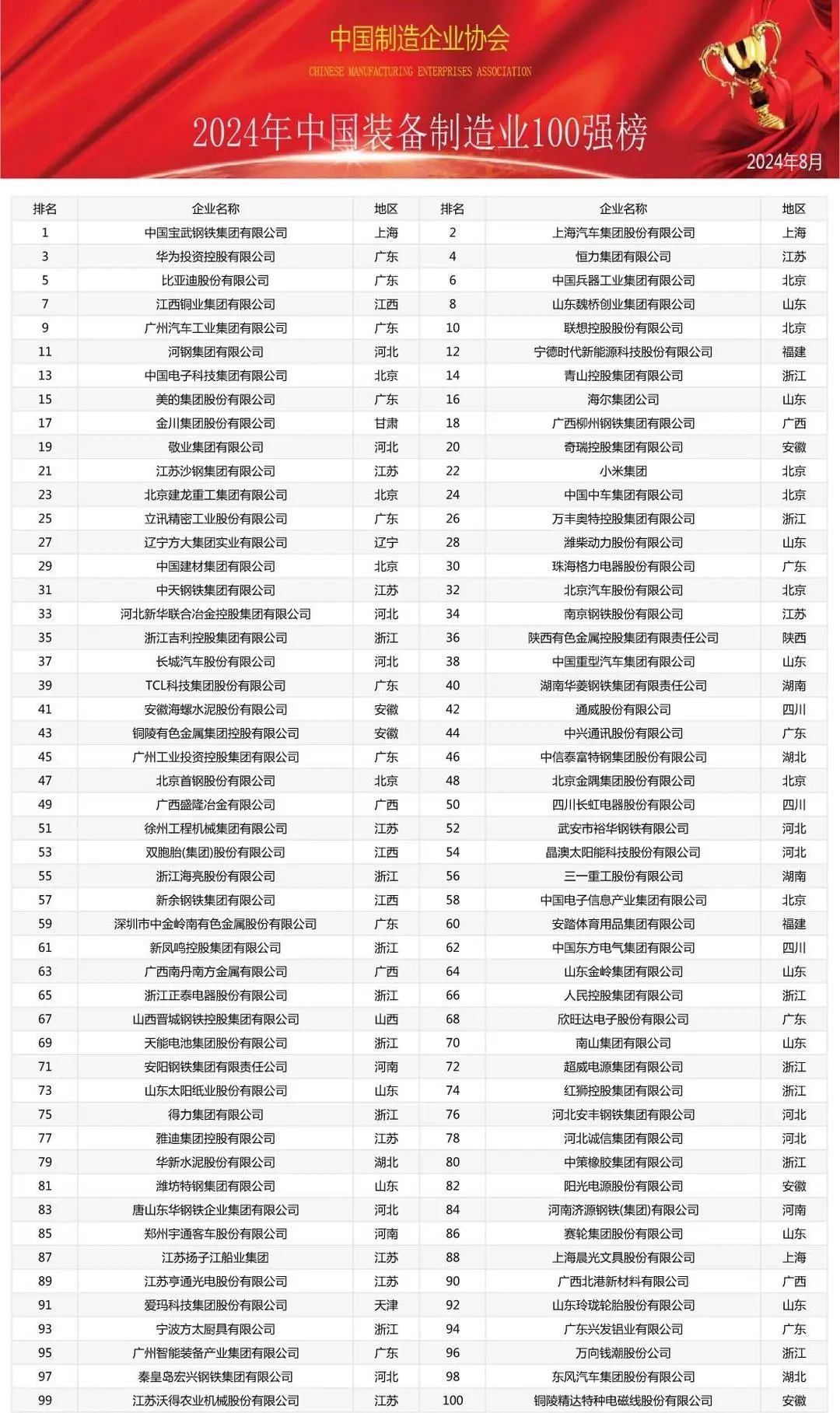 近日,中國制造企業協會對外發布《2024中國制造業綜合實力200強暨中國裝備制造業百強》榜單。