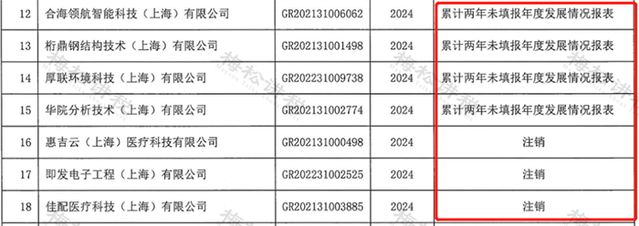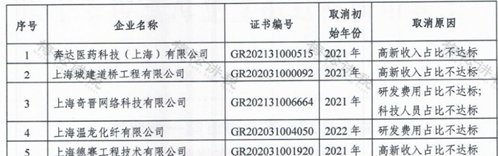 取消原因包括:注銷;研發(fā)費(fèi)用占比不達(dá)標(biāo);科技人員占比不達(dá)標(biāo);未正常開展經(jīng)營活動(dòng);累計(jì)2年未填報(bào)年度發(fā)展報(bào)告等。