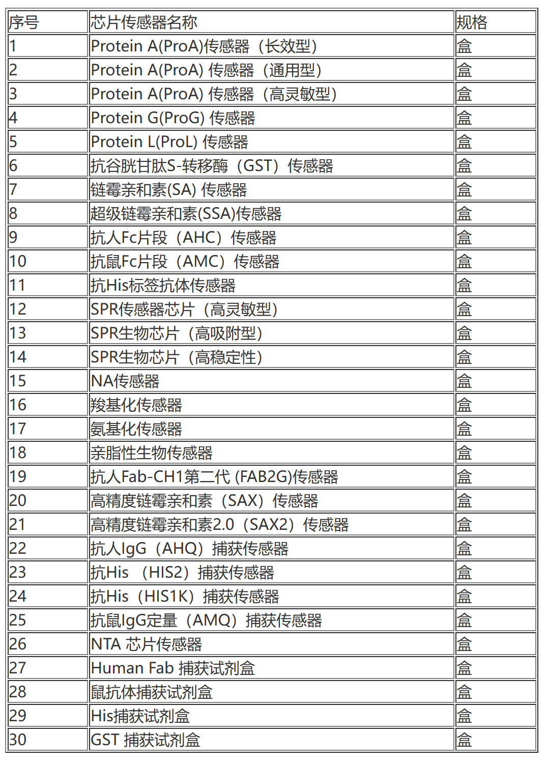 值得留意的是,本次采購(gòu)的貨物表面等離子共振分子互作儀對(duì)配套的40個(gè)芯片試劑盒列出了詳細(xì)清單,以滿足用戶依據(jù)研究課題方向自由組合的需求。
