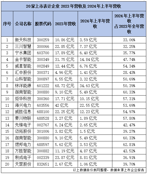 儀表網(wǎng)整理了20家上市表計(jì)企業(yè)2023年?duì)I業(yè)收入以及2024年上半年?duì)I業(yè)收入數(shù)據(jù),從中一窺我國表計(jì)產(chǎn)業(yè)今年和明年發(fā)展態(tài)勢。