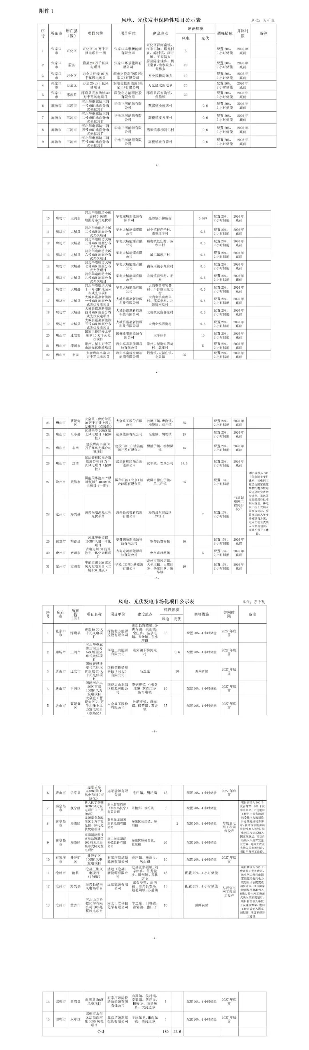 第二批:24個、2.5GW納入第二批的項目共25個,總規模259.5萬千瓦,其中保障性項目共13個、145萬千瓦,市場化項目共12個、114.5萬千瓦。根據調峰措施方面,保障性規模的配儲比例在15-20%/2小時,而市場化項目配儲比例大多為20%/4小時。第二批次獲得容量的項目業主中,唐山海泰新能源獲得規模最大,為500MW風電項目,另外華能(280MW,含100MW風電)、華電(250MW,含150MW風電)、大唐(220MW,含120MW風電)。國家電網(含136MW風電)和國家電投(全部為光伏)各獲得150MW項目。