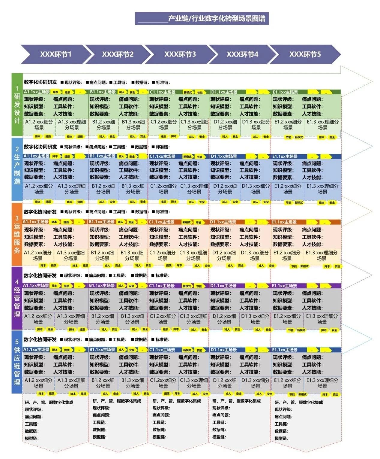 聚焦產業鏈上下游企業研發設計、生產制造、運維服務、經營管理、供應鏈管理等場景,以場景為切入點梳理數字化轉型痛點需求,繪制重點行業、重點產業鏈數字化轉型場景圖譜(簡稱“一圖譜”),明確企業數字化轉型路徑,促進產業鏈上下游企業協同開展轉型升級。分場景梳理數據要素、知識模型、工具軟件、人才技能等數字化轉型要素清單(簡稱“四清單”,合稱“一圖四清單”),助力政產學研各界聯合攻堅場景數字化轉型關鍵難點。
