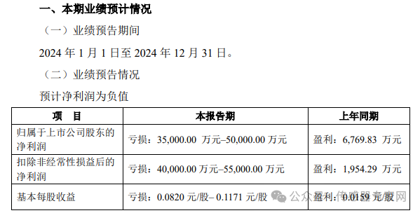 報告期內,歸屬于上市公司股東的凈利潤 -35,000.00 萬元~ -50,000.00 萬元,扣除非經常性損益后的凈利潤-40,000.00 萬元~ -55,000.00 萬元。