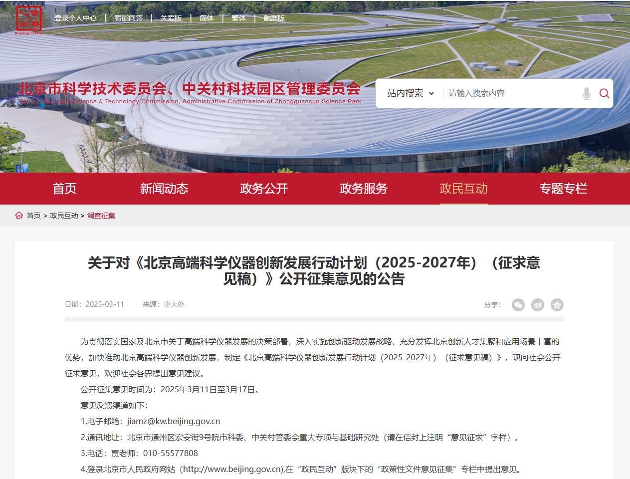 1. 《北京高端科學儀器創(chuàng)新發(fā)展行動計劃(2025-2027年)(征求意見稿)》
