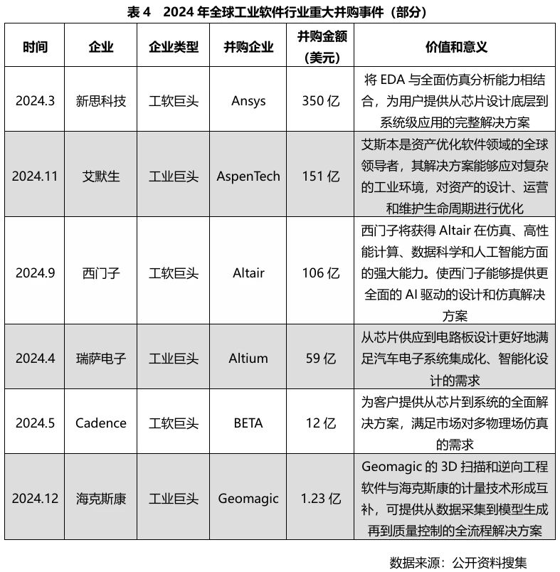 一方面,工業(yè)軟件巨頭之間進行并購整合,補全能力版圖;另一方面,工業(yè)巨頭也不斷并購工業(yè)軟件企業(yè),強化自身軟件實力。