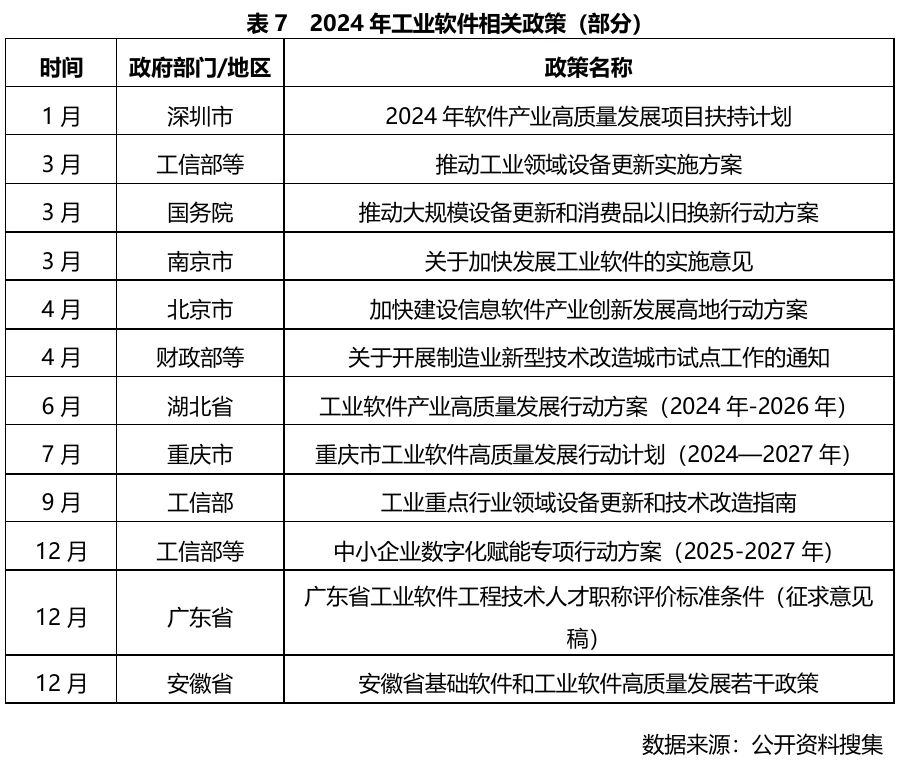 2024年,工信部等多部委、各地方政府進一步出臺工業(yè)軟件相關(guān)政策,其中《工業(yè)重點行業(yè)領(lǐng)域設(shè)備更新和技術(shù)改造指南》提出了2027 年完成約 200 萬套工業(yè)軟件和 80 萬臺套工業(yè)操作系統(tǒng)更新?lián)Q代任務(wù)。