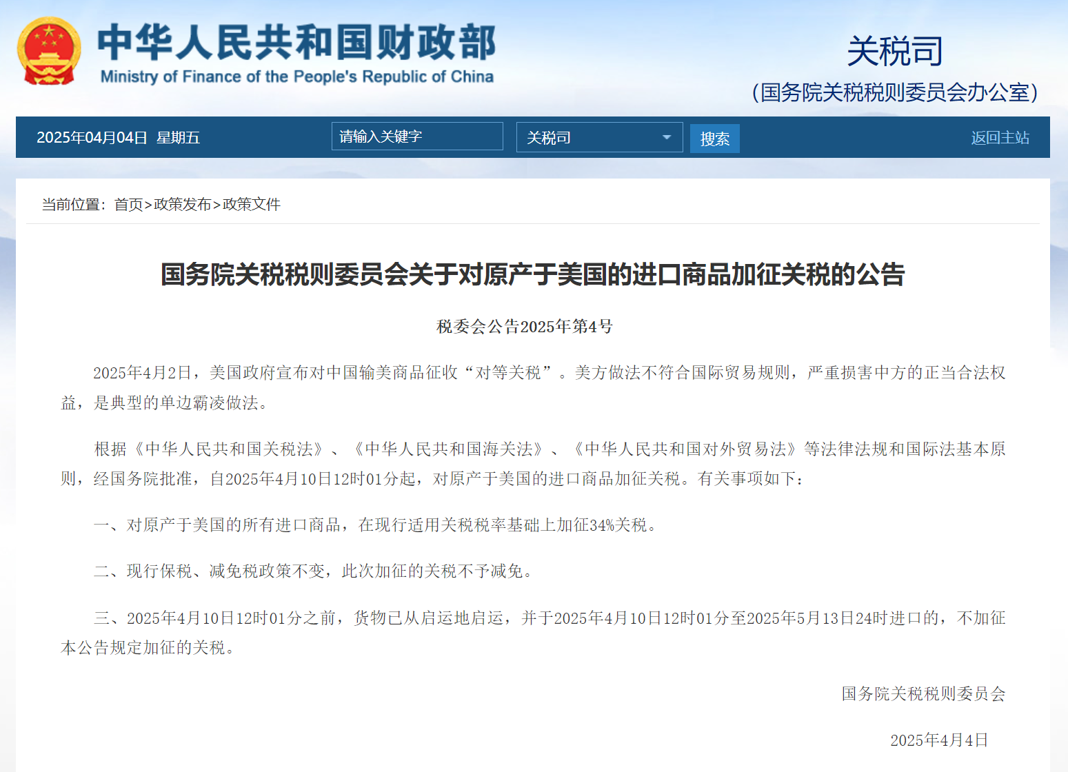 4月2日,美國政府宣布對所有貿(mào)易伙伴加征“對等關(guān)稅”,對中國商品加征稅率高達34%;4月4日,中國國務(wù)院關(guān)稅稅則委員會發(fā)布公告,自4月10日起對原產(chǎn)于美國的所有進口商品同等加征34%關(guān)稅。