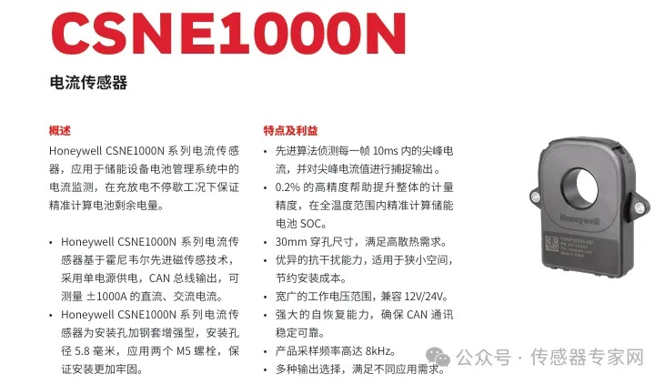 霍尼韋爾推出的CSNE 1000系列電流傳感器即在中國南京研發(fā)完成和生產,CSNE 1000系列電流傳感器是一款針對儲能等應用場景研發(fā)的高性能傳感器產品,已在全球多家儲能巨頭公司產品中應用。