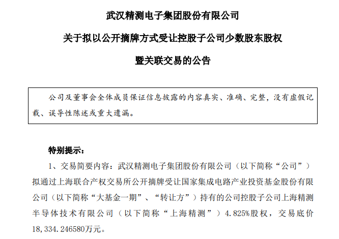 5月31日,精測電子(300567)公告,公司擬通過上海聯合產權交易所公開摘牌受讓國家集成電路產業投資基金股份有限公司(簡稱“大基金一期”)持有的公司控股子公司上海精測半導體技術有限公司(簡稱“上海精測”)4.825%股權,交易底價18,334.246580萬元。本次交易構成關聯交易,未構成重大資產重組,本次交易尚需公司股東大會審批通過。