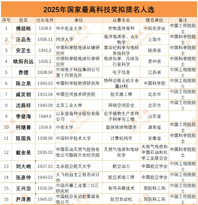 12025年國家最高科技獎,公示名單