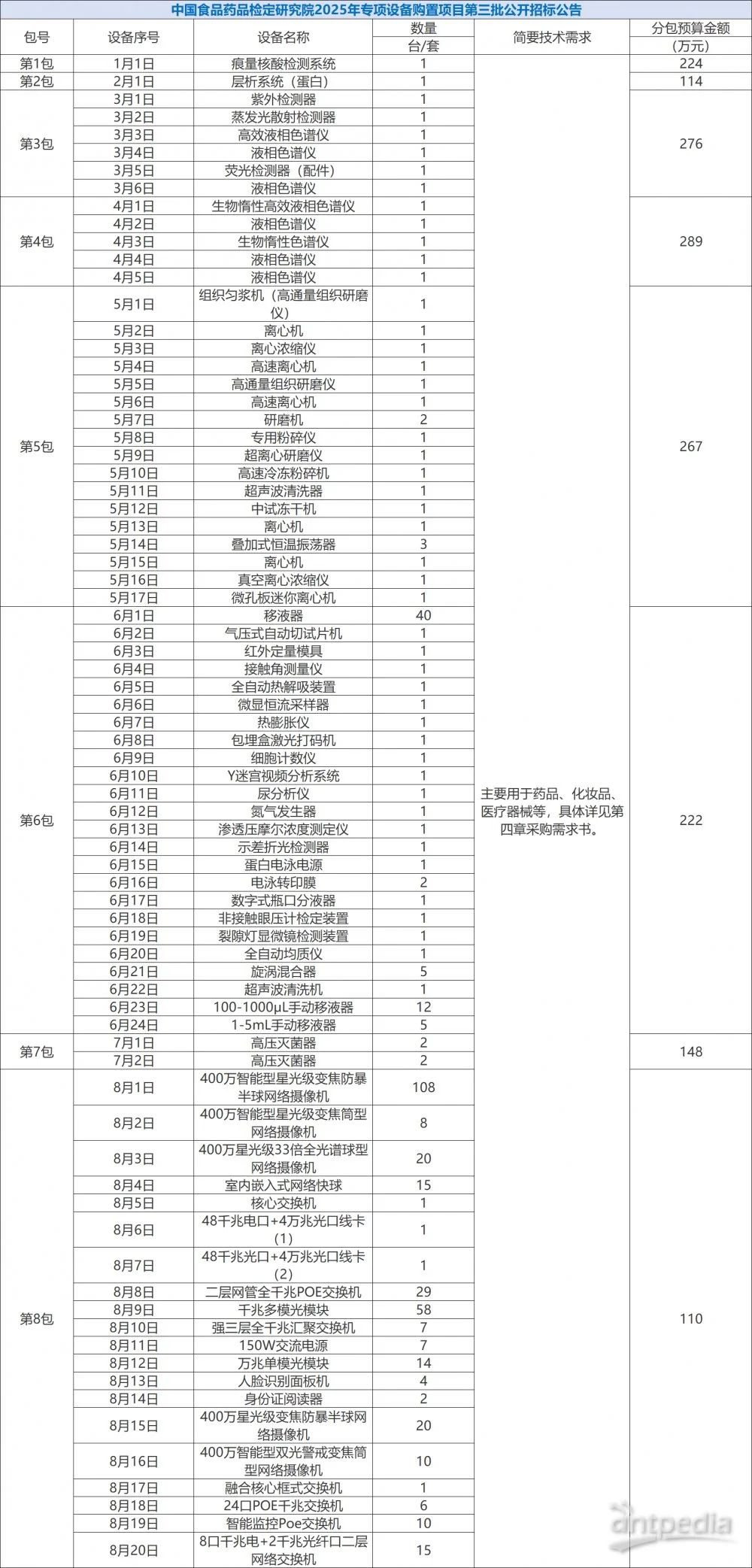 中國政府采購網消息,近日,中國食品藥品檢定研究院就2025年專項設備購置項目分別于6月24日和7月4日發布招標公告,招標總金額為6212萬元,采購的儀器設備共計605臺/套,包括超高效液相色譜儀、生物熒光微生物快檢系統、小動物活體成像系統等。