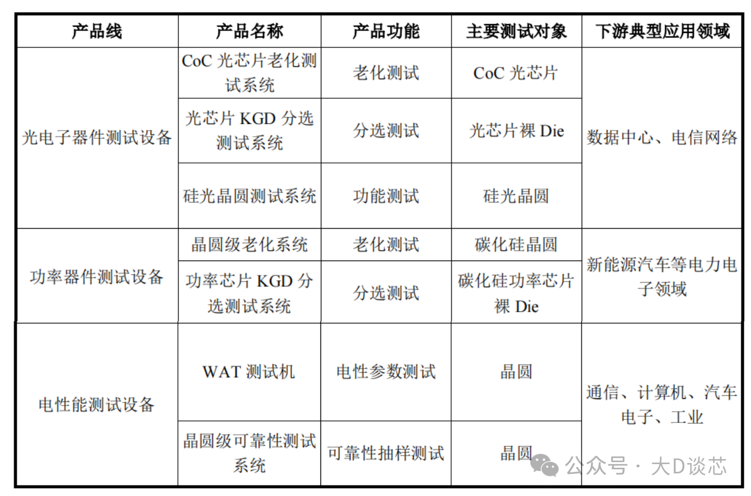 公司半導體測試設備包括主要面向光通信測試的光電子器件測試設備(CoC光芯片老化測試系統(tǒng)、光芯片KGD分選測試系統(tǒng)、硅光晶圓測試系統(tǒng)等),主要面向功率器件測試的功率器件測試設備(晶圓級老化系統(tǒng)、功率芯片KGD分選測試系統(tǒng)等),以及主要面向半導體集成電路測試的電性能測試設備(WAT測試機和晶圓級可靠性測試系統(tǒng))。