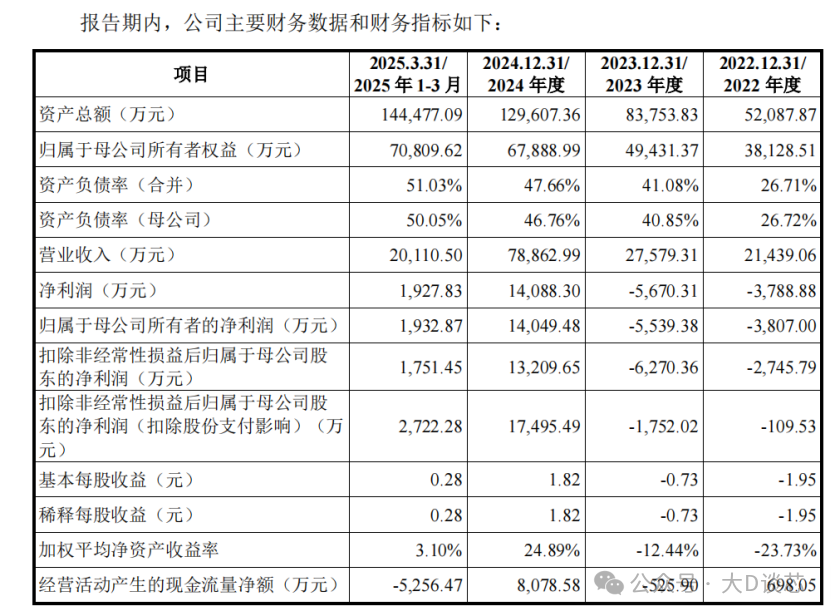 2022年至2025年3月,公司營業(yè)收入分別為2.144億元、2.758億元、7.886億元和2.011億元,歸屬于母公司股東的凈利潤分別為-3807.00萬元、-5539.38萬元、14,049.48萬元和1,932.87萬元。綜合毛利率分別為43.61%、60.50%、63.63%和65.33%。