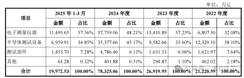 公司產(chǎn)品主要包括電子測量儀器和半導體測試設備,以及配套的測試部件及服務。2025年1-3月電子測量儀器的營業(yè)收入金額為11495.65萬元,占比57.56%;半導體測試設備的營業(yè)收入為6959.91萬元,占比34.85%。