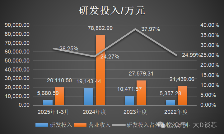 2022年至2025年3月,公司研發(fā)費用金額分別為5,357.28萬元、10,471.57萬元、19,143.44萬元和5,680.59萬元,占營業(yè)收入的比例分別為24.99%、37.97%、24.27%和28.25%,