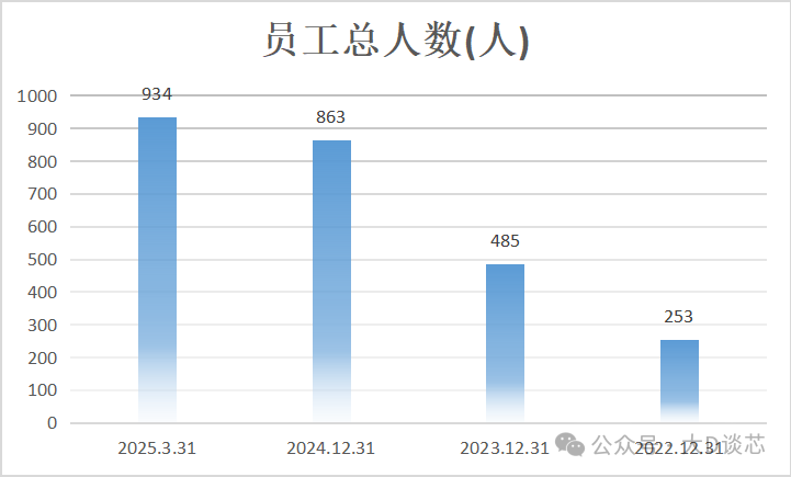2022年至2025年3月,公司員工總?cè)藬?shù)隨著業(yè)務的發(fā)展也在不斷增加,人數(shù)分別是253、485、863和934。