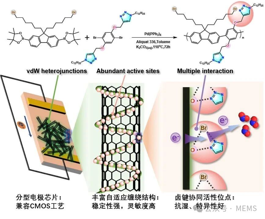 近日,中國科學院上海微系統所程建功團隊成功研發出一種高特異性、室溫工作的NO2傳感器。該氣體傳感器依托一種新型交替共軛聚合物,與碳納米管自適應纏繞為剛柔并濟的骨架結構,形成特異性鹵鍵側鏈協同作用位點,實現對NO2分子的精準捕獲與感知。室溫下檢測下限達到1.8 ppb,并具有優異的選擇性和環境穩定性,適用于智能建筑、工業廠房、環境監測站等多場景NO2氣體檢測。