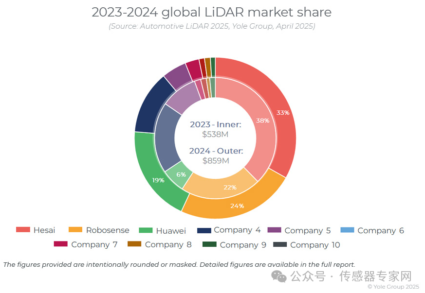 據(jù)今年4月份,咨詢(xún)機(jī)構(gòu)Yole Group發(fā)布最新全球激光雷達(dá)產(chǎn)業(yè)報(bào)告《Automotive LiDAR 2025 》(2025車(chē)載激光雷達(dá)報(bào)告)數(shù)據(jù)顯示,中國(guó)激光雷達(dá)廠(chǎng)商禾賽科技占據(jù)33%的市場(chǎng)份額,其次是速騰聚創(chuàng)(24%)、華為(19%)和圖達(dá)通。這四家中國(guó)廠(chǎng)商占據(jù)了88%的市場(chǎng)份額。