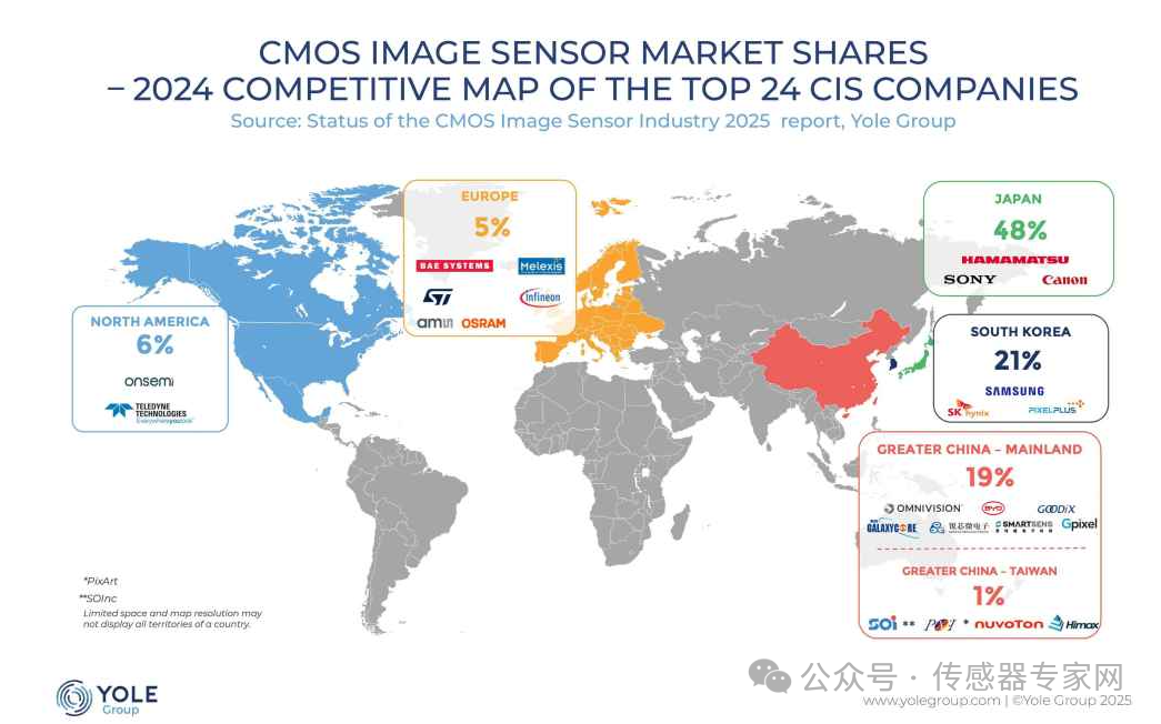根據(jù)Yole 《Status of the CMOS Image Sensor Industry 2025》(《2025 年 CMOS 圖像傳感器行業(yè)現(xiàn)狀》)報(bào)告顯示,以豪威集團(tuán)(原韋爾股份、Omnivision)、格科微(Galaxycore)、思特威(Smartsens)、比亞迪(BYD)、長(zhǎng)光辰芯(Gpixel)、匯頂科技(Goodix)、銳芯微為代表的中國(guó)大陸CMOS圖像傳感器產(chǎn)生,占據(jù)全球19%的市場(chǎng)份額。此外,中國(guó)臺(tái)灣省的原相科技、晶相科技、敦泰科技等廠(chǎng)商,合計(jì)占1%市場(chǎng)份額。