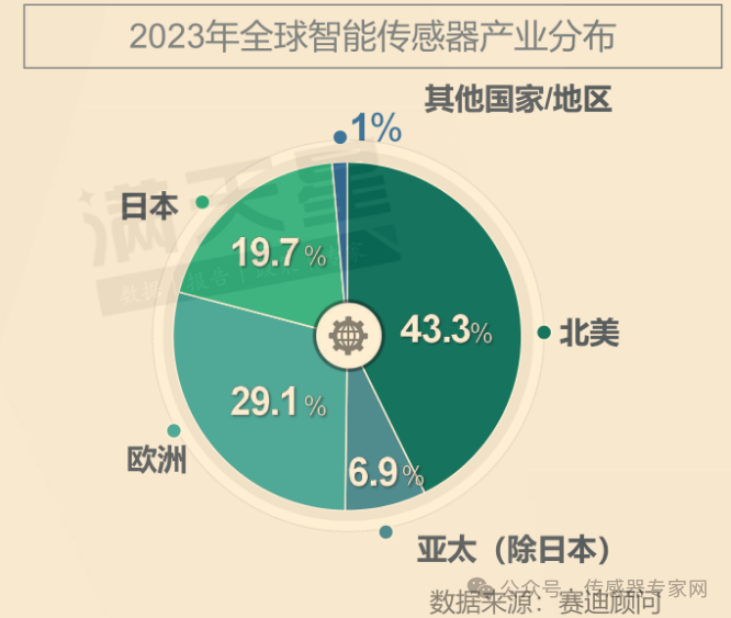 然而,在高精尖的智能傳感器市場(chǎng),2023年全球智能傳感器產(chǎn)業(yè)由北美、歐洲、日本主導(dǎo),其中,北美占比最高,達(dá)43.3%,歐洲占比29.1%,日本占比19.7%,亞太地區(qū)(除日本)占比6.9%,其他國(guó)家/地區(qū)占比1%。
