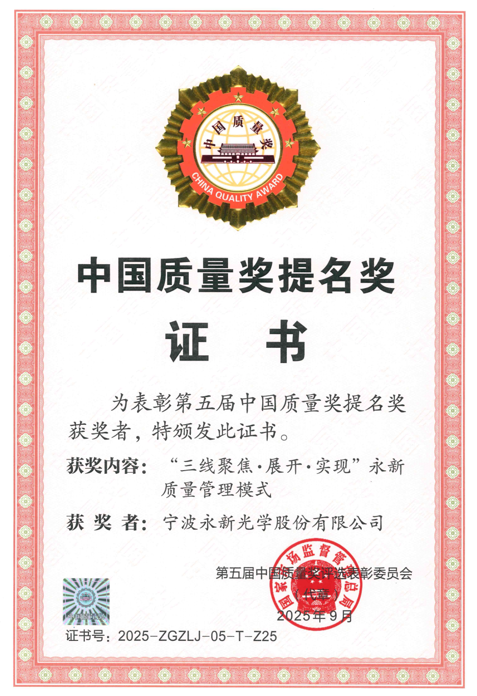 公司將以此次中國質量獎提名作為新起點,持續深化全面質量管理,推進質量、效率和動力變革,不斷提升企業核心競爭力,為中國光學制造業的高質量發展樹立標桿,為中國式現代化貢獻更多 “永新智慧” 和 “永新力量”。
