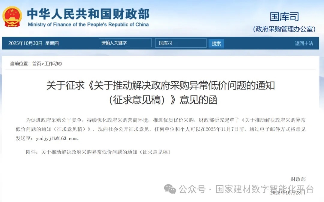 10月28日,財政部發(fā)布關(guān)于征求《關(guān)于推動解決政府采購異常低價問題的通知(征求意見稿)》意見的函。