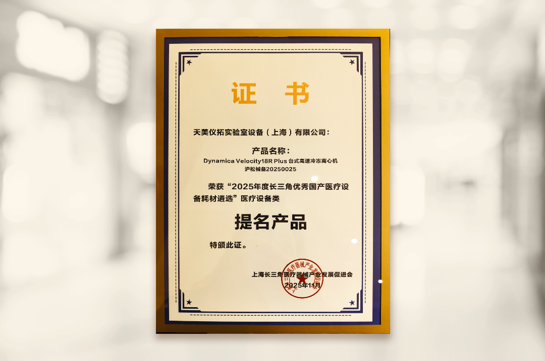 天美旗下Dynamica Velocity18R Plus臺(tái)式高速冷凍離心機(jī)從眾多國(guó)產(chǎn)設(shè)備中脫穎而出,榮獲“2025年度長(zhǎng)三角優(yōu)秀國(guó)產(chǎn)醫(yī)療設(shè)備耗材遴選”醫(yī)療設(shè)備類提名產(chǎn)品。