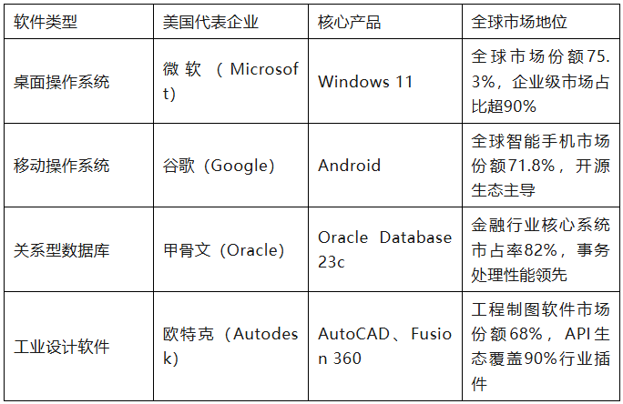美國企業(yè)通過技術(shù)標(biāo)準(zhǔn)制定與生態(tài)構(gòu)建形成雙重壟斷。微軟憑借.NET框架與DirectX技術(shù)體系,構(gòu)筑Windows的開發(fā)者護(hù)城河;甲骨文數(shù)據(jù)庫以ACID特性與RAC集群技術(shù),成為銀行核心系統(tǒng)的“標(biāo)配”;Synopsys的EDA工具鏈更是深度綁定全球半導(dǎo)體產(chǎn)業(yè),形成“設(shè)計(jì)工具-制造工藝”的共生體系。歐洲企業(yè)在特定領(lǐng)域補(bǔ)充布局,如法國達(dá)索系統(tǒng)的CATIA軟件壟斷航空航天設(shè)計(jì)市場,德國西門子的PLM系統(tǒng)占據(jù)制造業(yè)數(shù)字化平臺(tái)35%份額。