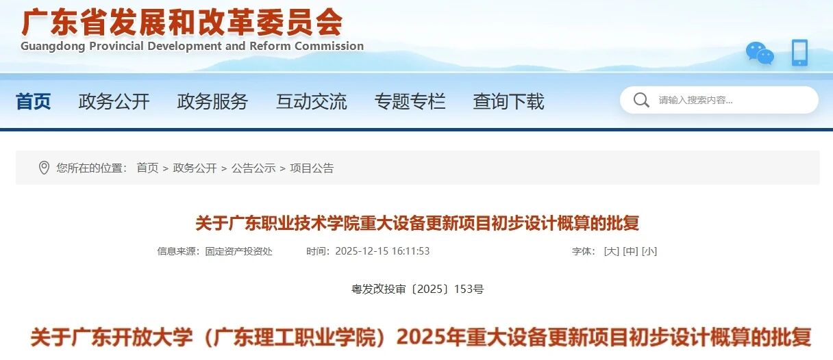 12月15日,廣東省發展和改革委員會連續發布兩項批復——“關于廣東職業技術學院重大設備更新項目初步設計概算的批復”以及“關于廣東開放大學(廣東理工職業學院)2025年重大設備更新項目初步設計概算的批復”。根據批復,兩所院校擬更新購置共142臺(套)教學科研儀器設備,總投資14930萬元。