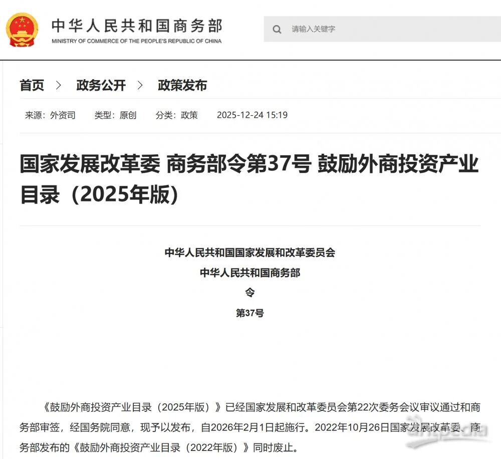 近日,經(jīng)國務(wù)院同意,國家發(fā)展改革委、商務(wù)部全文發(fā)布《鼓勵(lì)外商投資產(chǎn)業(yè)目錄(2025年版)》(以下簡稱《鼓勵(lì)目錄》),自2026年2月1日起施行。