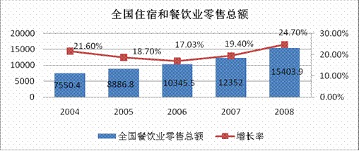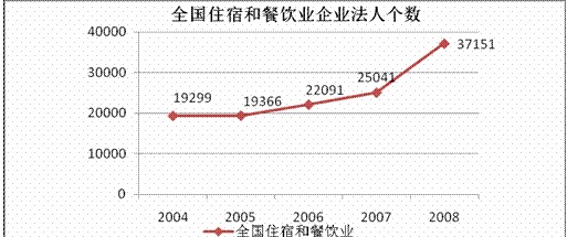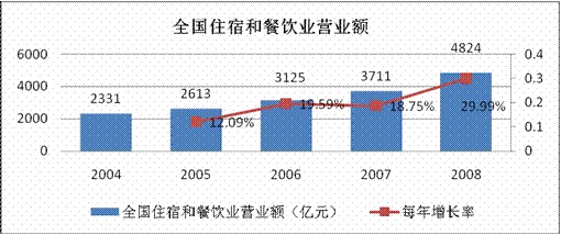 從國(guó)家統(tǒng)計(jì)局網(wǎng)站上了解到2008年我國(guó)從事住宿和餐飲的企業(yè)法人有37151個(gè),全國(guó)餐飲業(yè)營(yíng)業(yè)額已達(dá)到4824億元,每年的復(fù)合增長(zhǎng)率達(dá)到20%。